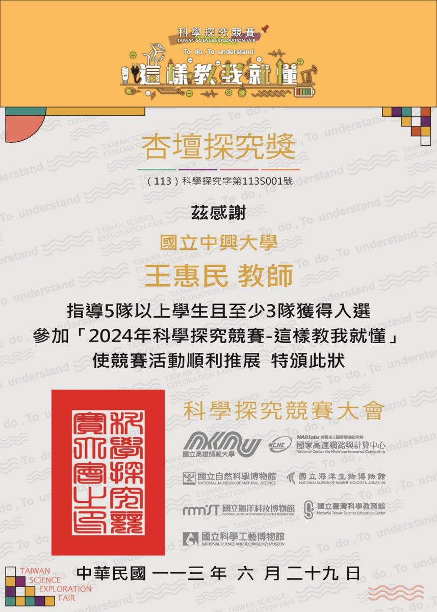 王惠民教授指導學生獲獎 - 2024年 教育部 科學探究競賽